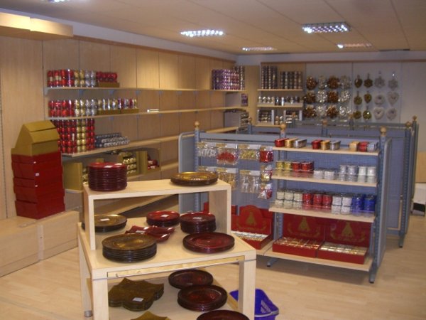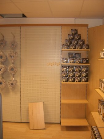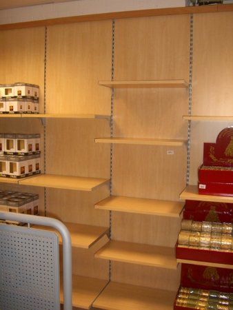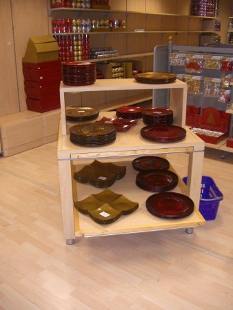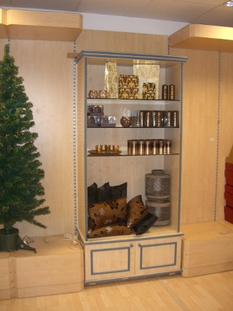 Zum Einsatz kamen u.a. Holzrückwände aus Buche sowie Böden aus Holz und Glas. Ebenso wurden Verkaufspyramiden zur Warenpräsentation verwendet.
